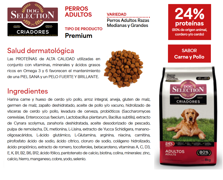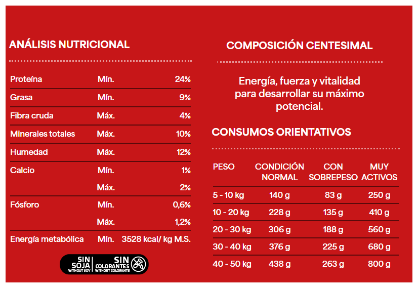 Harina carne y hueso de cerdo y/o pollo, arroz integral, arveja, gluten de maíz, germen de maíz, zapallo deshidratado, aceite de pollo y/o vacuno, hidrolizado de vísceras de cerdo y/o pollo, levadura de cerveza, probióticos (Saccharomyces cerevisiae, Enterococcus faecium, Lactobacillus plantarum, Bacillus subtilis), extracto de Cynara scolymus, zanahoria deshidratada, aceite desodorizado de pescado, pulpa de remolacha, DL metionina, L-Lisina, extracto de Yucca Schidigera, manano-oligosacáridos, L-ácido glutámico, L-Glutamina, arginina, niacina, carnitina, pirofosfato ácido de sodio, ácido cítrico, cloruro de sodio, colágeno hidrolizado, ácido propiónico, extracto de romero, tocoferoles, betacaroteno, vitaminas A, C, D3, E, K, B1, B2, B6, B12, ácido fólico, pantotenato de calcio, biotina, colina, minerales: zinc, calcio, hierro, manganeso, cobre, yodo, selenio.