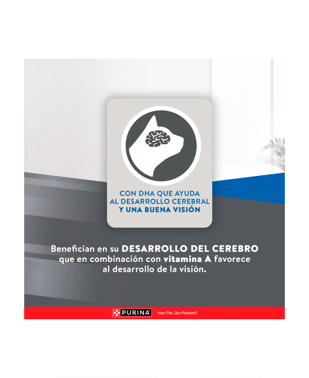 Con DHA proveniente de fuentes de pescado y/o de alga, cumple una función clave para el desarrollo saludable del cerebro del gatito.