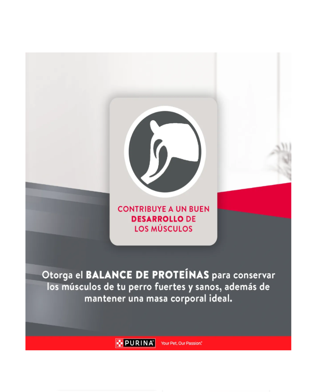 MANTENIMIENTO DE MÚSCULOS FUERTES Y SANOS El equilibrio adecuado de proteínas de alta calidad ayuda a conservar los músculos de tu perro fuertes y sanos, manteniendo una masa corporal magra.