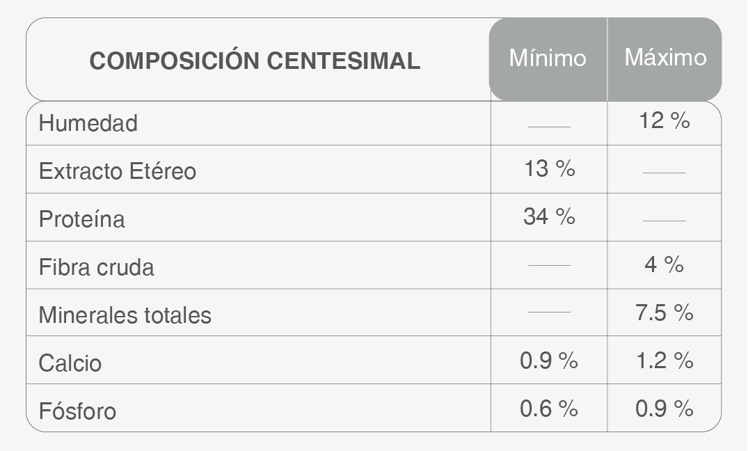 Harina de carne vacuna, harina de pollo, arroz, gluten de maíz, trigo, harina de germen de maíz, aceite de pollo, aceite de pescado (fuente de omega 3 y 6), huevo en polvo, plasma bovino en polvo, hidrolizado proteico de pollo, pulpa de remolacha (fuente de fructo-oligosacáridos – FOS), leche en polvo, levadura de cerveza, sal, carbonato de calcio, zeolita, fosfato de calcio, dióxido de titanio, dipropionato de amonio, ácido propionico, pirofosfato ácido de sodio, metionina, celulosa en polvo, ácido citrico, tocoferoles, taurina, extracto de yucca schidigera, vitaminas A, D3, E, K, B1, B2, B6, B12, ácido fólico, ácido nicotínico, ácido pantotenico, biotina, colina, minerales: zinc, hierro, cobre, yodo, manganeso y selenio.