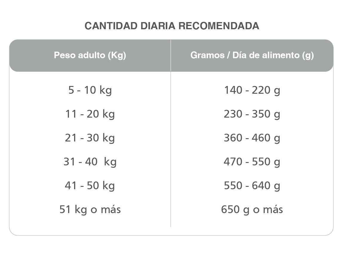 Harina de carne vacuna, harina de pollo, aceite de pollo, maíz, gluten de maíz, trigo, germen de maíz, salvado de trigo, harina de soja, arveja, grasa vacuna, levadura de cerveza, pulpa de remolacha (fuente de fructo-oligosacáridos), sal yodada; hidrolizado proteico de pollo, ácido cítrico, tocoferoles, dipropionato de amonio, ácido propiónico; núcleo vitamínico-mineral: vitaminas A, D3, E, K, B1, B2, B6, B12, ácido fólico, ácido nicotínico, ácido pantoténico, biotina, colina; minerales: zinc, hierro, cobre, yodo, manganeso, selenio.