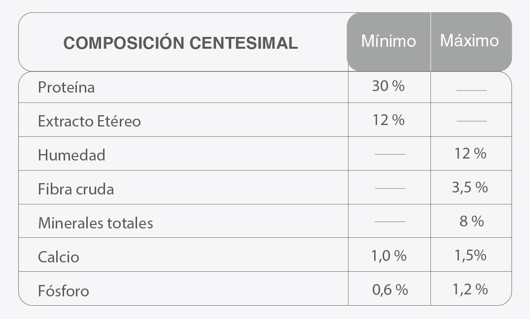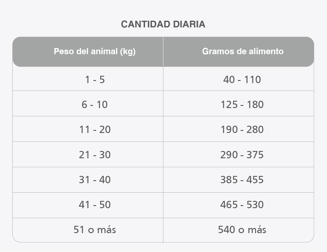 Harina de cordero, arroz integral, arveja, gluten de maíz, germen de maíz desgrasado, grasa animal (pollo), aceite de salmón (fuente de omega 3 y 6), hidrolizado proteico de menudencias vacunas, porcinas y aviares, pulpa de remolacha (fuente de fructo-oligosacáridos- FOS), levadura de cerveza, zeolita, sal, extracto de yucca schidigera, manano-oligosacáridos – MOS, nucleótidos de levadura, carbonato de calcio, dipropionato de amonio, ácido propiónico, acetato de zinc, pirofosfato ácido de sodio, glucosamina, condroitin sulfato, colágeno hidrolizado, ascorbato de manganeso, metionina, antioxidantes naturales: extracto de romero, vitamina C, betacaroteno, ácido cítrico, tocoferoles, licopeno, luteína, polifenoles, taurina, vitaminas: A, D3, E, K, B1, B2, B6, B12, ácido fólico, ácido nicotínico, ácido pantoténico, biotina, colina, minerales: zinc, hierro, cobre, yodo, selenio.