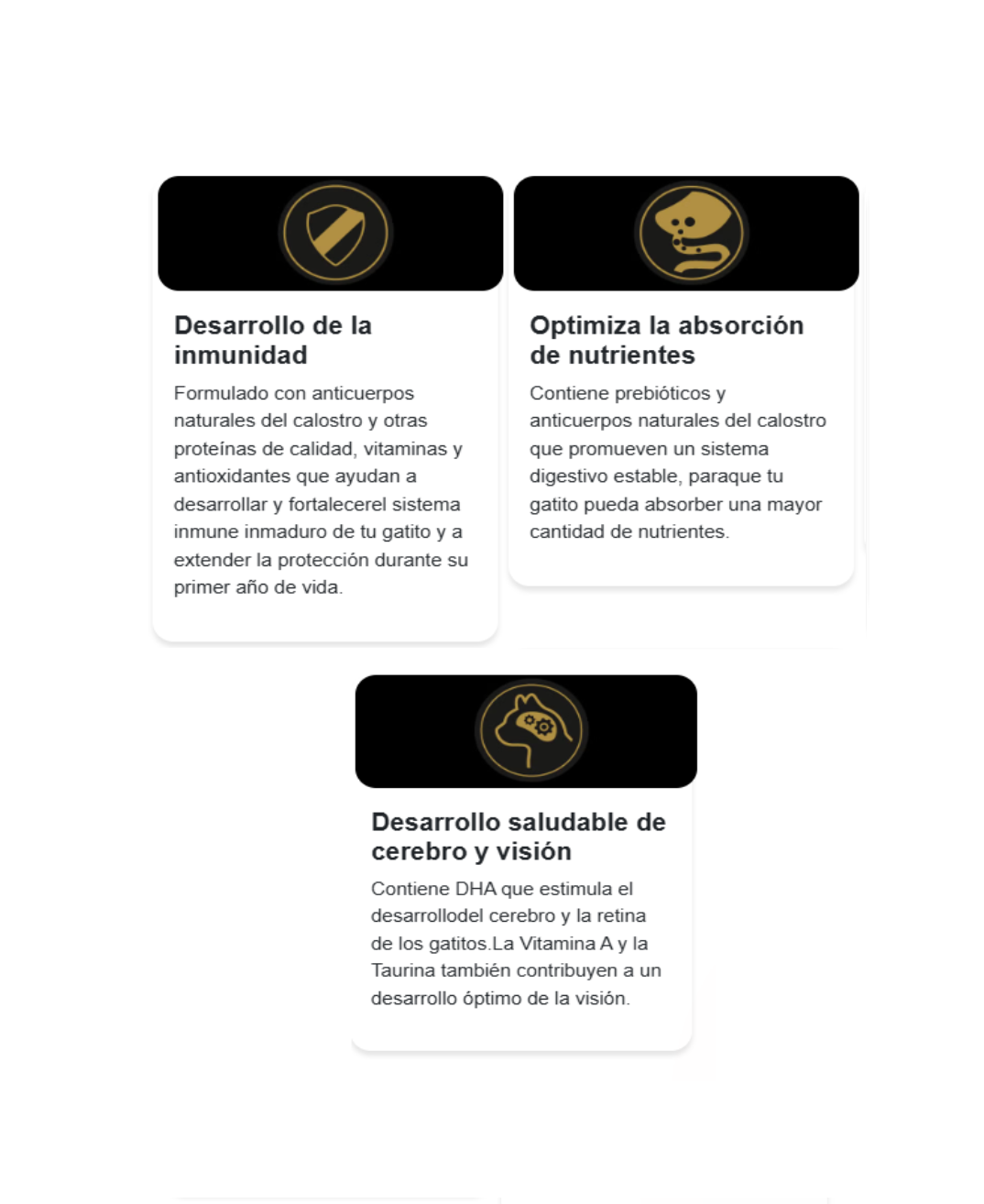 Incluye DHA que estimula el desarrollo del cerebro y la retina de los gatitos. La Vitamina A y la Taurina también aportan a un desarrollo óptimo de la visión.