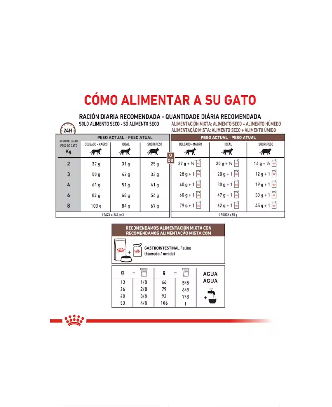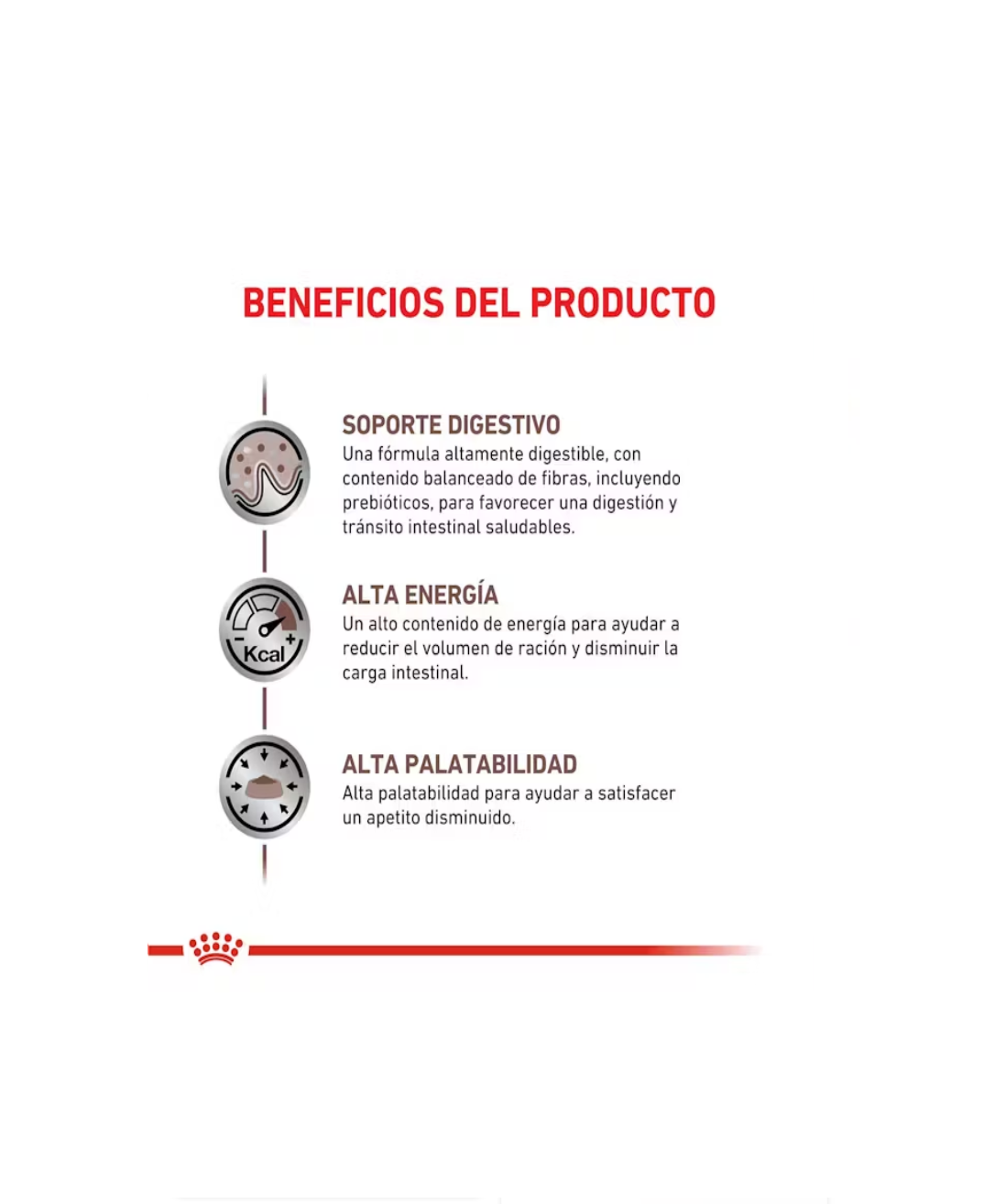 está formulado para contribuir al control de los desórdenes intestinales agudos que afectan la absorción y para promover la recuperación nutricional y la convalecencia. La combinación de proteínas de alta digestibilidad (proteínas L.I.P*), prebióticos (fructo-oligosacáridos y manano-oligosacáridos), pulpa de remolacha, arroz y aceite de pescado contribuye a lograr una máxima seguridad digestiva. Aporta una alta densidad energética que permite cubrir los requerimientos energéticos del gato a la vez que ayuda a reducir el volumen de la ración y así disminuir la carga gastrointestinal. Además, contribuye a promover la recuperación del peso ideal durante el período de convalecencia.