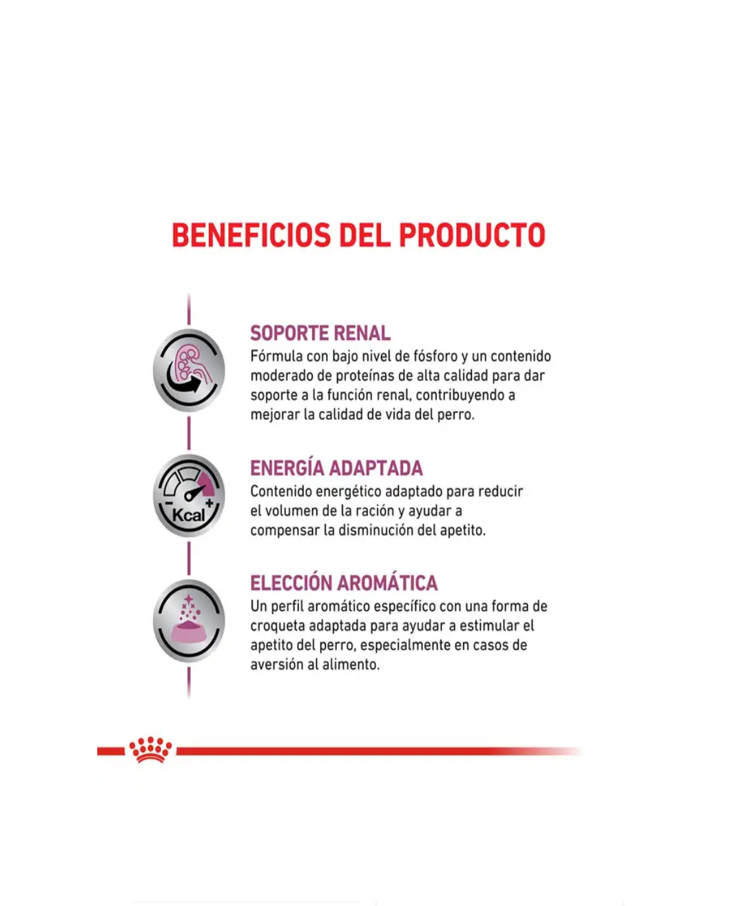 Alimento indicado para perros adultos formulado para ayudar a mantener la función renal en caso de insuficiencia renal crónica, a través de sus niveles restringidos de fósforo y proteínas de alta calidad.